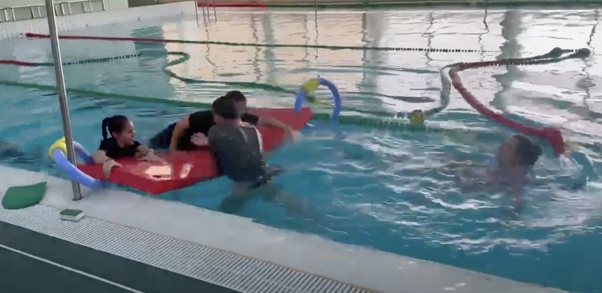 “A team of adventurers falls off a boat during a storm - WITH CLOTHES! The aim is to survive, swim to the shore (edge of the pool), collect supplies (objects), and save their colleagues who were left behind (swim together with a colleague).”