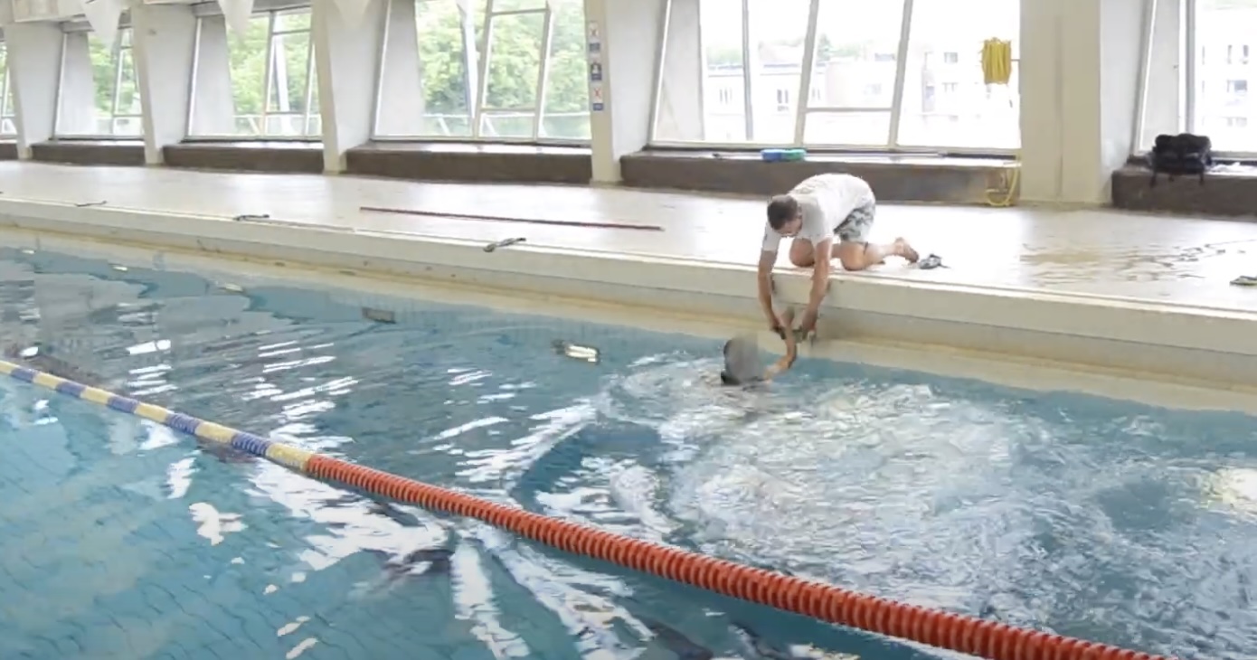 The student swims along the edge. Every 5 metres, he picks up a heavy object (which they may or may not attach, depending on the equipment). He decides when to turn around so that he can bring all the weights back to the starting point.